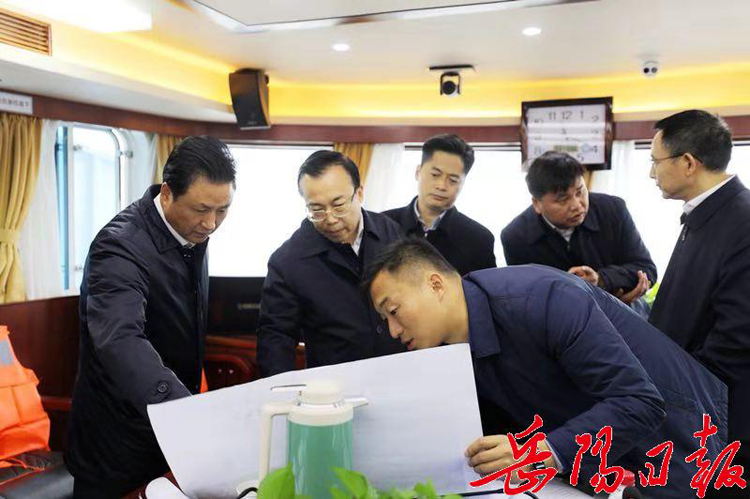 向力力一行从市地方海事局码头乘船前往岳阳县东洞庭湖矮围整治现场,一边看,一边问,详细了解矮围整治实施情况和工作进度。