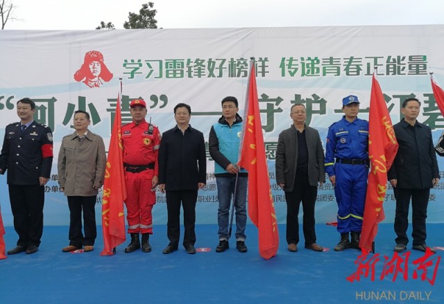 岳阳市委副书记陈爱林,市委副秘书长黄岳山,市委宣传部副部长、市文明办主任章宏平,岳阳海事局局长左中君,市水利局副局长朱敬礼,湖南理工学院团委书记薛静等为“河小青”团队、青年突击队授旗。陈爱林发出动员令,要以实际行动学习雷锋精神,努力践行习近平总书记的殷殷嘱托,非常有意义。真诚期待能有更多的青年,更多的单位、企业、协会和市民参与到学雷锋、护碧水活动中来,以实际行动书写新时代的雷锋故事。
