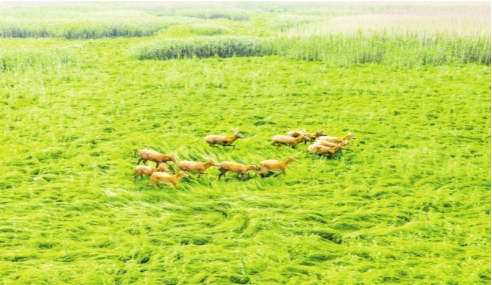 在东洞庭湖国家级自然保护区,麋鹿的数量不断增加。它们在草地上尽情奔跑嬉戏,见证岳阳生态优先、绿色发展之路。