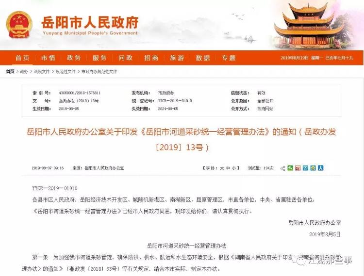 获悉,日前,市水利局发布《岳阳市河道采砂统一经营管理办法》(以下简称《办法》),使我市河道采砂实行统一经营管理有据可依,同时,进一步规范我市的河道采砂管理工作。