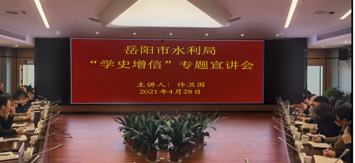 为推动党史学习教育深入开展,4月28日,岳阳市水利局召开了“学史增信”专题宣讲会。市委党史学习教育宣讲团成员、市委宣传部原常务副部长、原二级巡视员许卫国应邀作专题辅导报告,局党组副书记、副局长刘利文主持,局领导及全体党员干部职工参加。