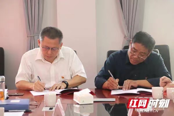 岳阳市水利局党组成员、副局长许石兵(左)与汨罗市大荆镇大荆社区总支部书记周平伟(右)现场签订林长“党员协理长”党建合约