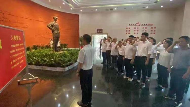 在何长工纪念馆,全体党员认真参观学习,重温入党誓词。