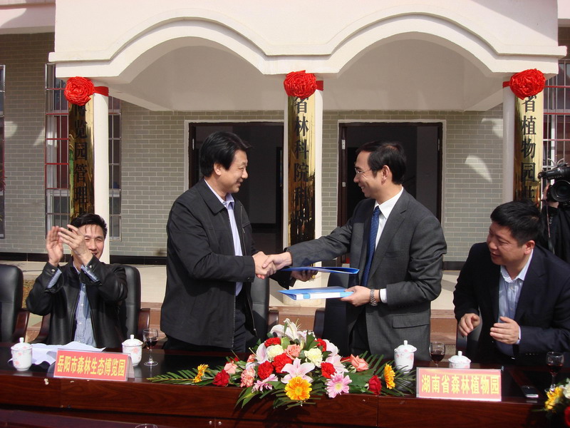 2010 年3月18日 上午,湖南省森林植物园党委书记王明旭、主任彭春良一行来到湖南省林科院岳阳分院森林生态博览园,与博览园签署了联合共建协议,该协议的签订,将极大促进博览园的建设,提升岳阳分院的科研技术水平。