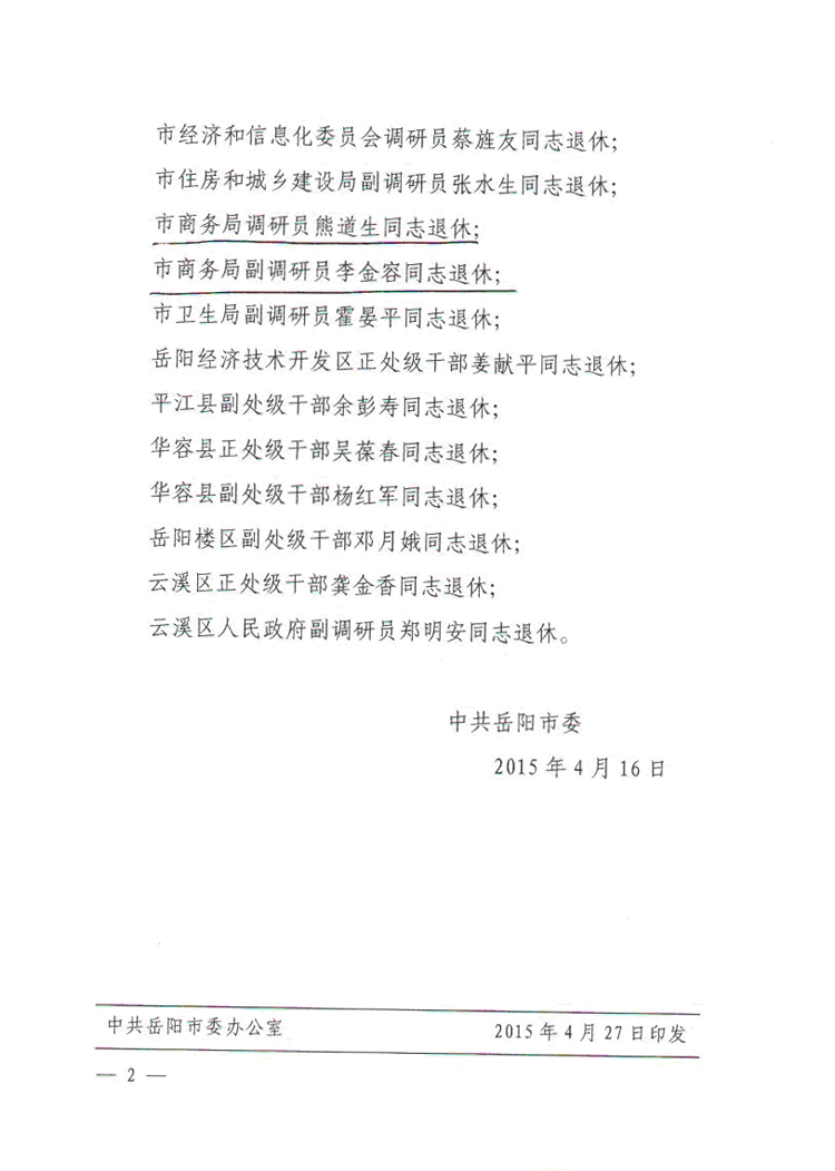 关于熊道生、李金容等同志退休的通知