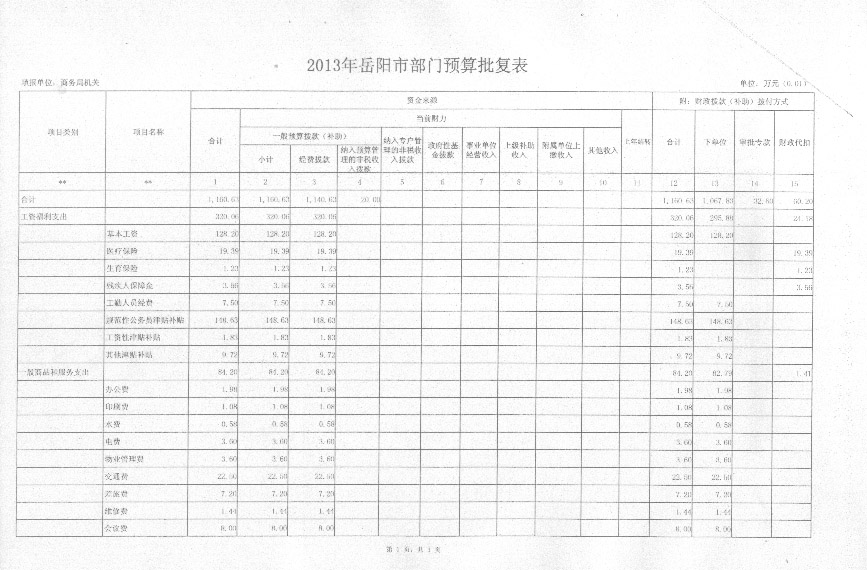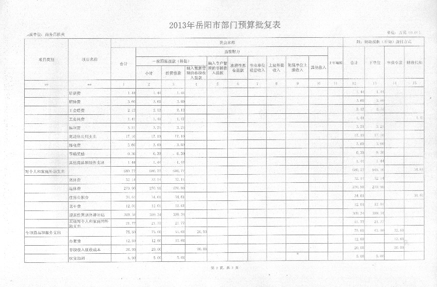 2013年岳阳市商务局财政预算批复表