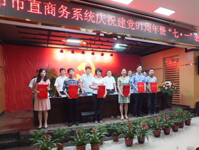 6月28日上午9时,为庆祝中国共产党成立91周年,弘扬先进、树立典型,进一步推动市商务系统党的工作向前发展,市商务系统直属机关党委在市烟草局2楼会议室举行了“岳阳市直商务系统庆祝建党91周年暨七·一表彰大会”,市商务局、市烟草局、市工商局、市粮食局、市市场建设管理处等单位70多名党员与会,市直工委领导方克君、市商务局副局长宋岳军、市商务局机关党委书记韩湘龙、市工商局工会主席高明芳、市粮食局副局长司马孟军、市烟草局机关党委书记唐有富出席。大会表彰了一批先进基层党组织、优秀共产党员和优秀党务工作者。