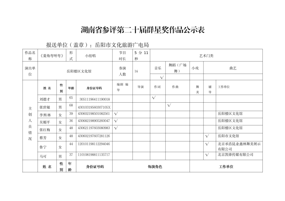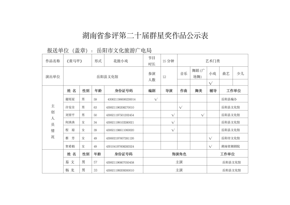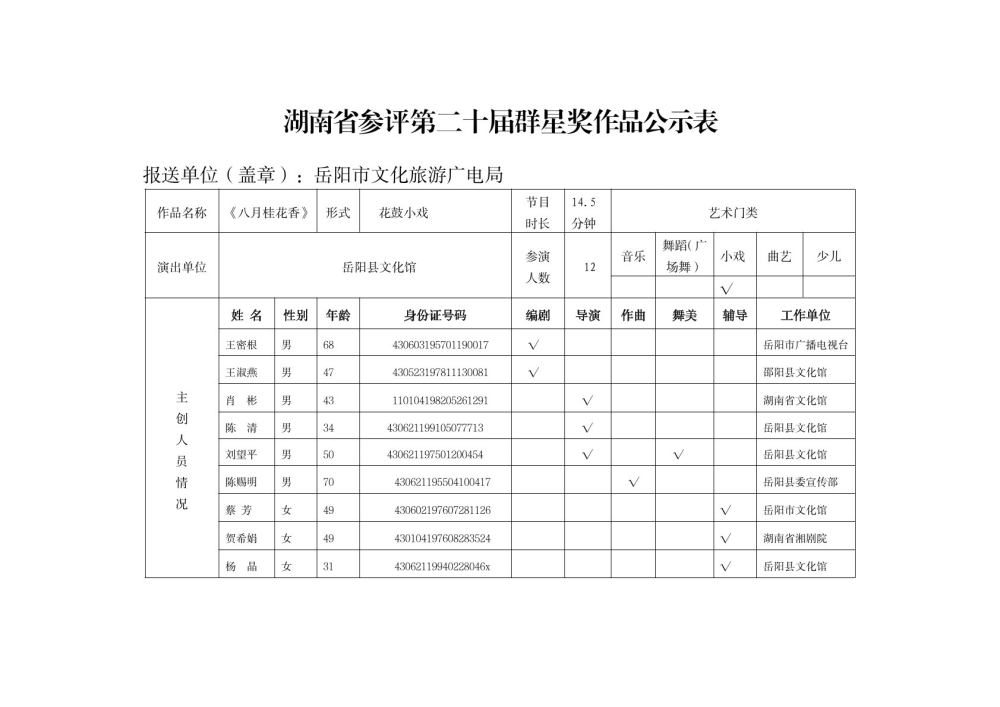 根据省文旅厅工作安排,经各县市区申报、市级推荐、省级评审等环节,现将岳阳市参评第二十届群星奖的作品情况予以公示,公示时间2025年5月9日至5月13日。公示期间如有异议可通过书面形式向市文化旅游广电局反映。以单位名义反映的,应加盖单位公章;以个人名义反映的,应署真实姓名及联系方式。