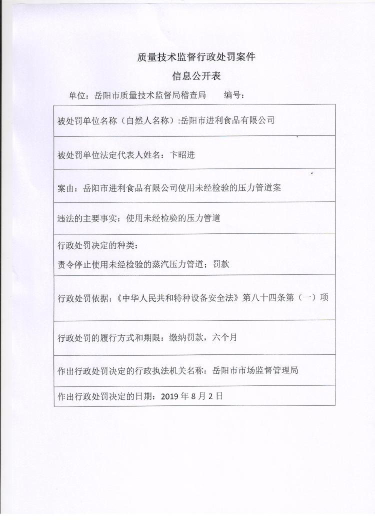 岳阳市市场监督管理局行政处罚决定书(岳阳市进利食品有限公司使用未经检验压力管道案)