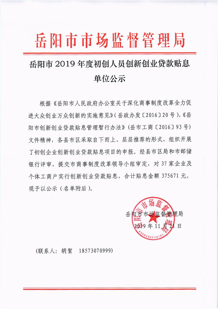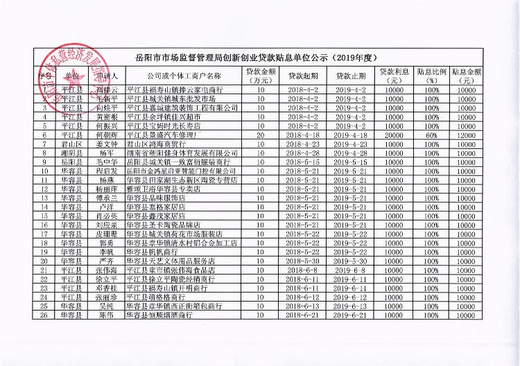 岳阳市2019年度初创人员创新创业贷款贴息单位公示