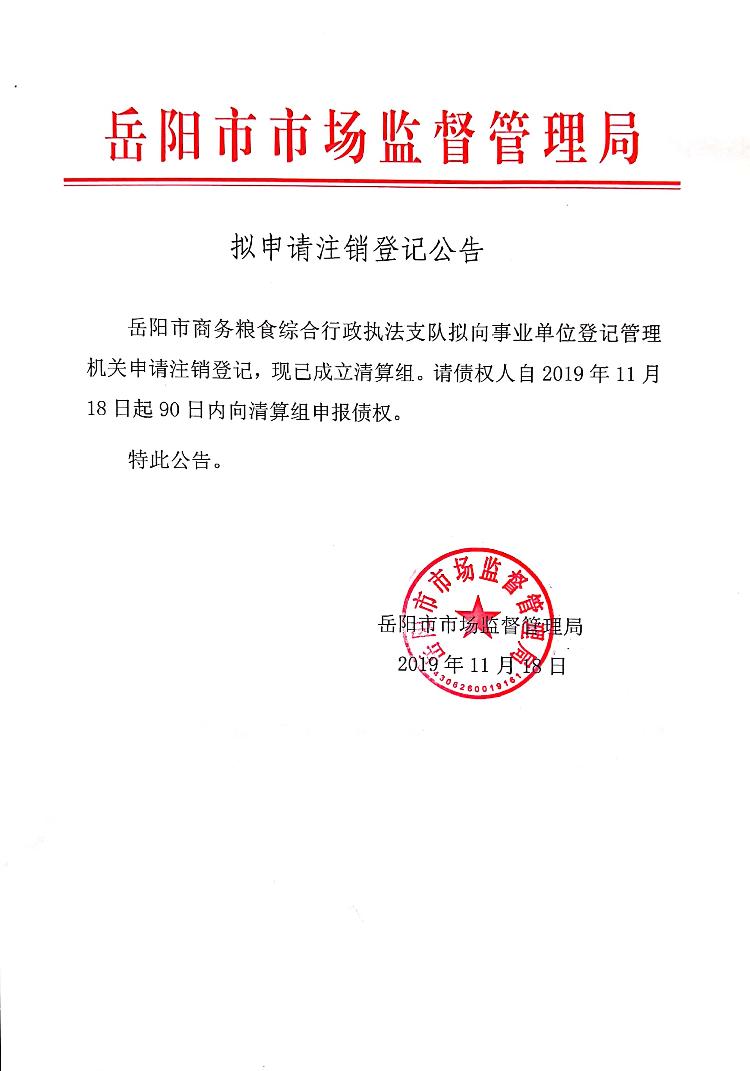 拟申请注销登记公告(岳阳市商务粮食综合行政执法支队)