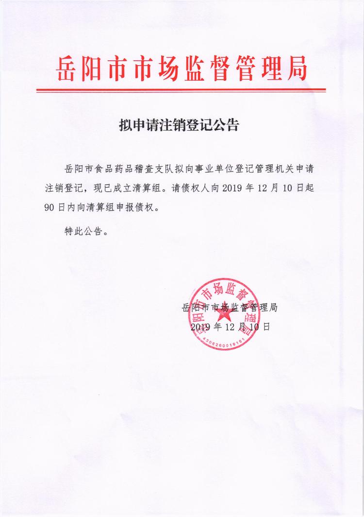 拟申请注销登记公告(岳阳市食品药品稽查支队)