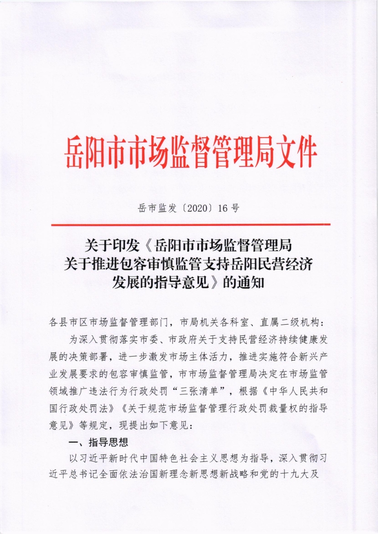 关于印发《岳阳市市场监督管理局关于推进包容审慎监管支持岳阳民营经济发展的指导意见》的通知