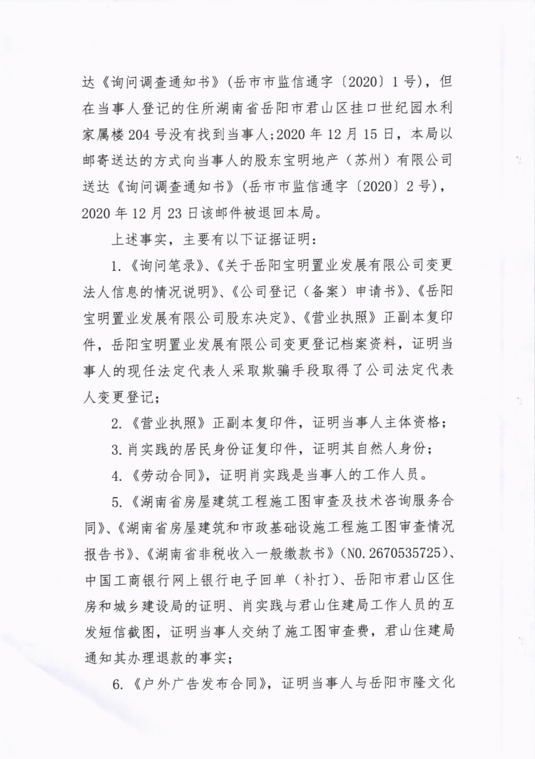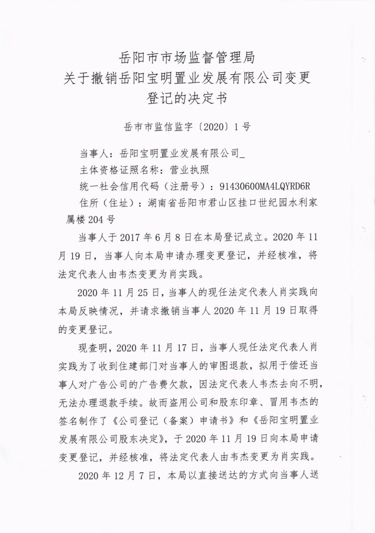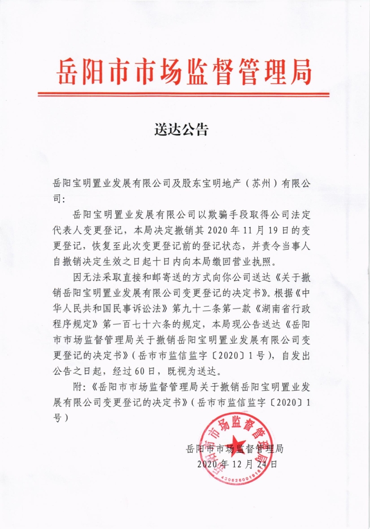 送达公告(关于撤销岳阳宝明置业发展有限公司变更登记的决定书)