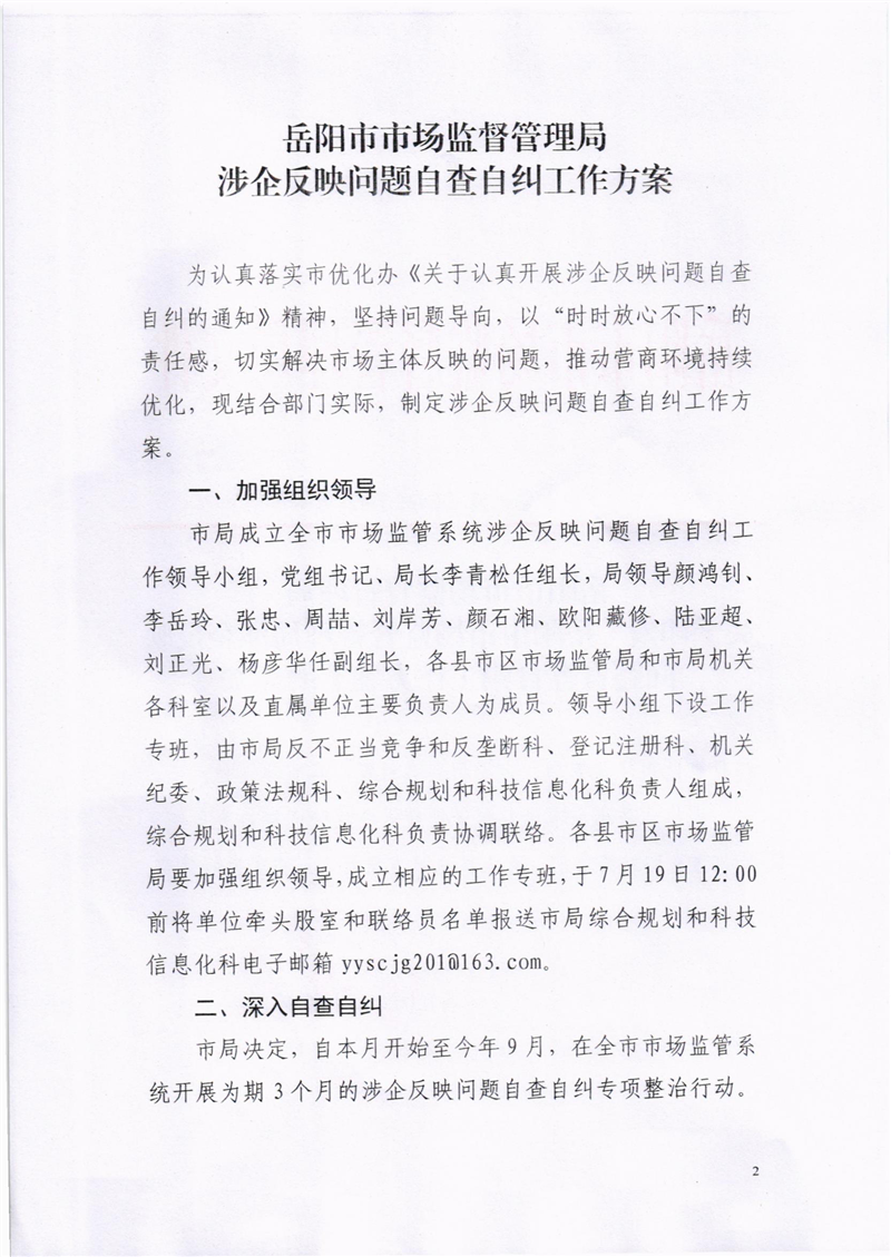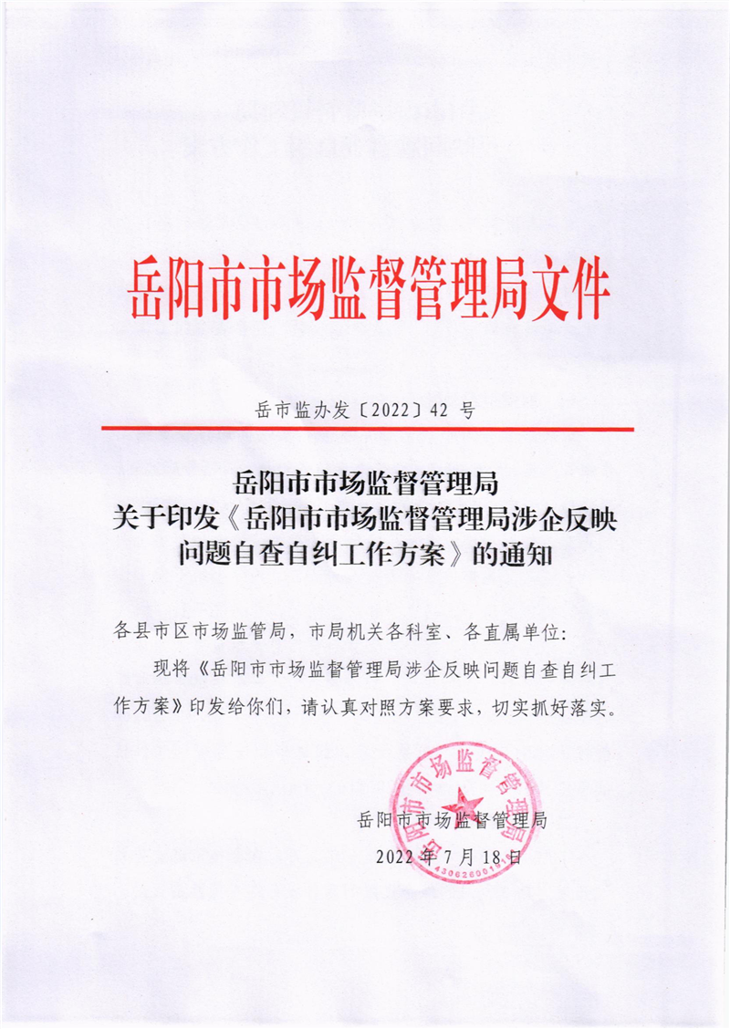 岳阳市市场监督管理局关于印发《岳阳市市场监督管理局涉企反映问题自查自纠工作方案》的通知