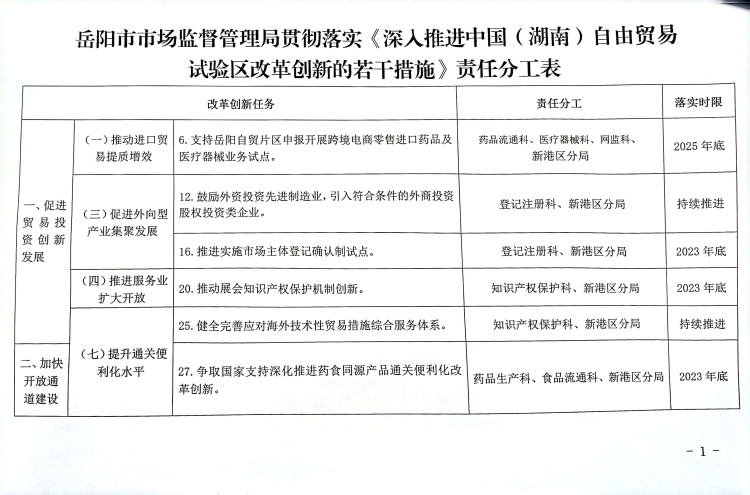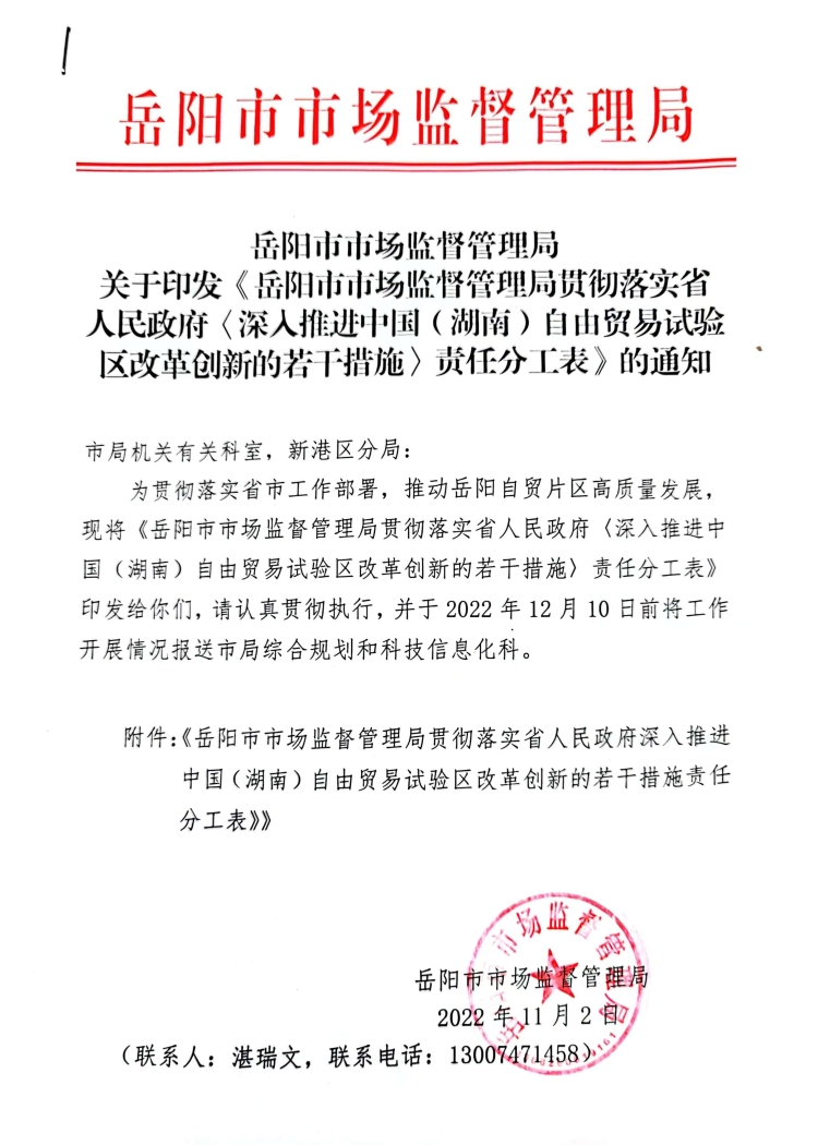 岳阳市市场监督管理局关于印发《岳阳市市场监督管理局贯彻落实省人民政府〈深入推进中国(湖南)自由贸易试验区改革创新的若干措施〉责任分工表》的通知