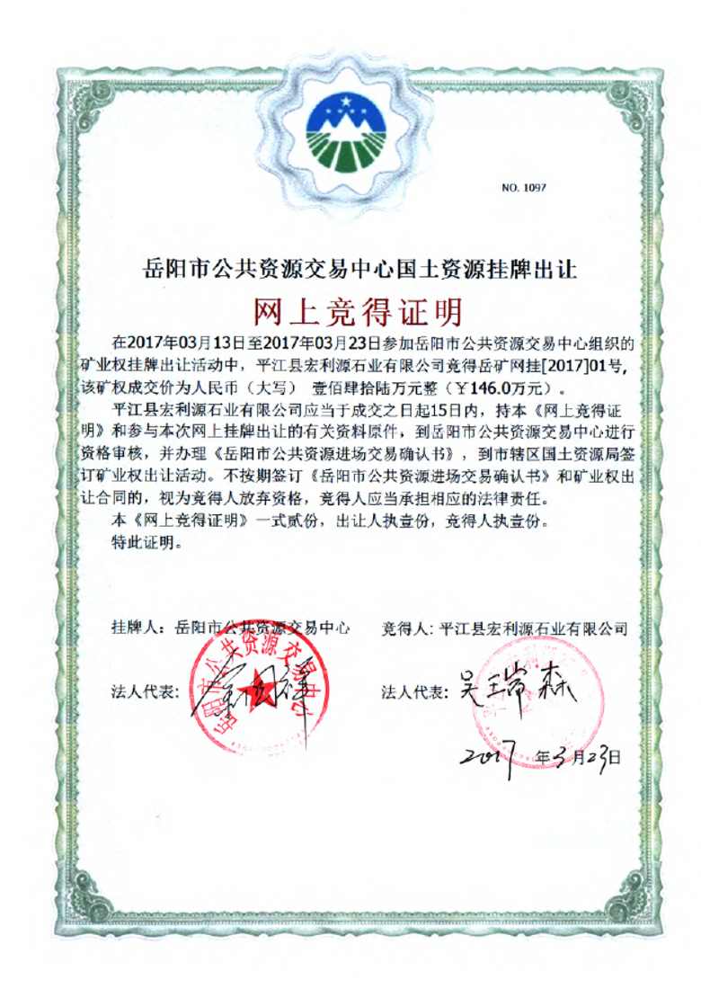 3月23日上午9:00,岳矿网挂〔2017〕01号矿业权在我中心网上挂牌截止成交。该矿业权位于平江县梅仙镇石塘村,矿区面积0.536平方公里,开采矿种为饰面用花岗岩,通过网上挂牌,此宗矿业权最终由平江县宏利源石业有限公司以人民币146万元竞得,为我中心新系统上线后首宗挂牌交易的矿业权。为推进此宗矿业权尽快挂牌,我中心积极与市国土局反复沟通讨论,全力协调解决了矿业确权等问题,争取了此宗矿业权于2017年2月20日正式上线交易。至此,所有国土资源交易类项目已全部进场。