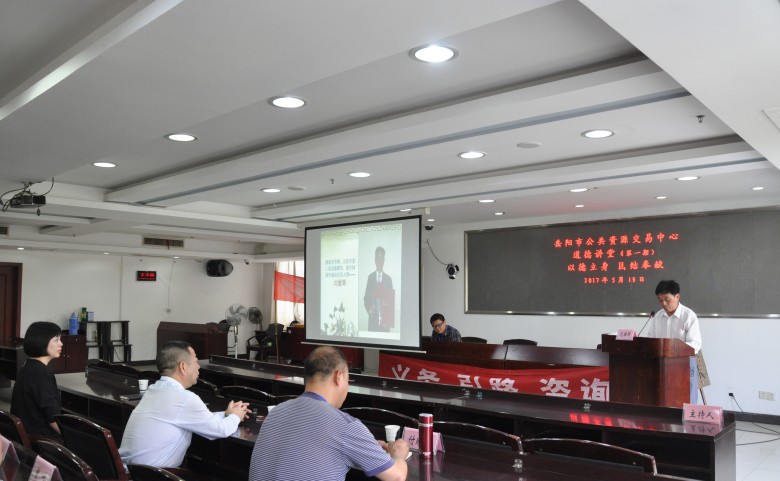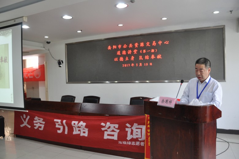 为深入贯彻《公民道德建设实施纲要》,深入学习道德模范乐于奉献的精神,扎实推进社会主义核心价值体系建设,根据市文明办部署,我中心于2017年5月19日下午在四楼道德讲堂开展了“以德立身,团结奉献” 为主题的首期“道德讲堂”活动。中心党组书记、主任余国祥出席了该次活动并致辞。