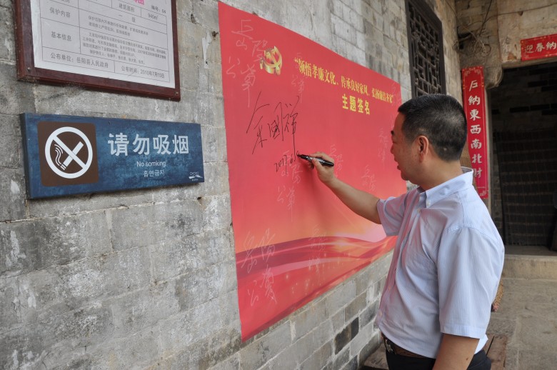 之后,组织开展了“领悟孝廉文化、传承良好家风、弘扬廉洁齐家”主题活动。重温了《中国共产党廉洁自律准则》、齐诵了“张谷英人族谱家训”等,开展了主题签名活动,中心全体党员干部一丝不苟地在自制红绸布上签下了自己的名字。这条镌刻着一代“岳阳公资”人名字的红布将永久保存。