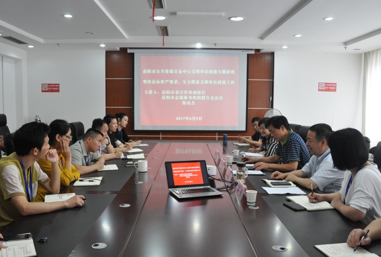 为切实提高公共资源交易服务水平,牢固树立 “团结、务实、规范、高效”的文明形象,全力打造人民满意的公共资源交易平台,中心党组提出了“2017年争创市级文明单位”的工作目标。6月9日,为进一步强化和确保文明单位创建工作的顺利实施,我中心请到了市委宣传部副部长,同时担任岳阳市志愿服务组织联合会会长的徐远杰同志来为全体干部职工进行一堂《坚持高标准严要求 全力推进文明单位创建工作》的专题讲座。