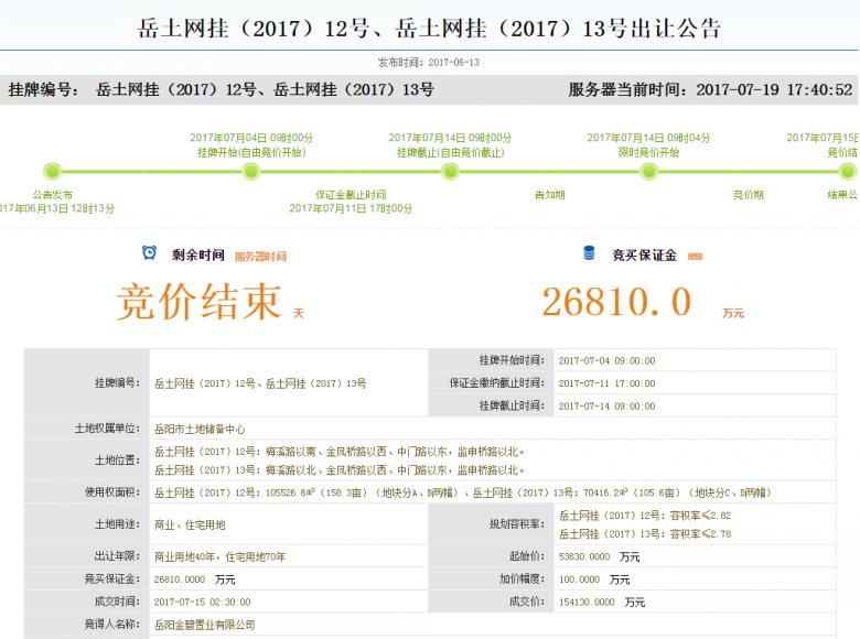 (图为岳阳金碧置业有限公司竞得该地块使用权的交易信息)