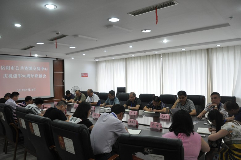 7月31日,为热烈庆祝中国人民解放军建军90周年,岳阳市公共资源交易中心组织全体转业、复员、退伍军人在六楼会议室召开了庆祝建军90周年座谈会。中心党组书记、主任余国祥、党组成员、副主任刘月平、党组成员、副主任傅晓斌参加了会议,党组成员、副主任刘月平主持了会议。