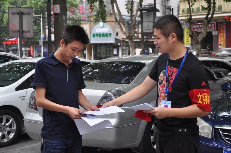 (中心安排文明劝导员向市场主体传发普法知识宣传单)