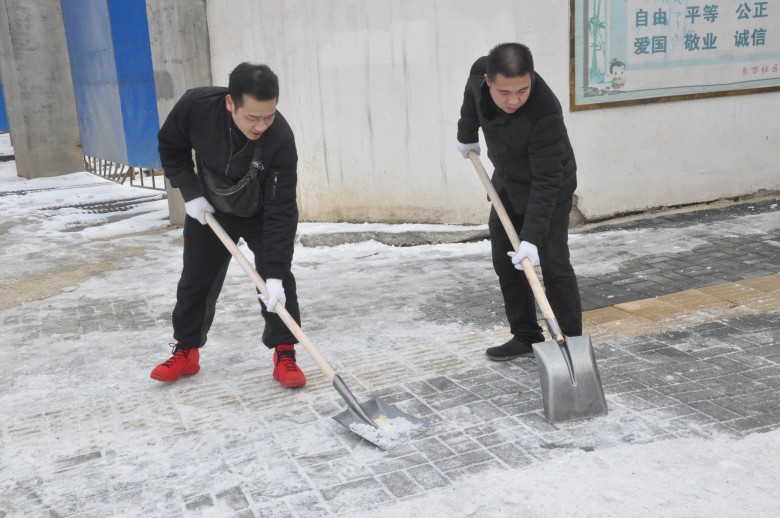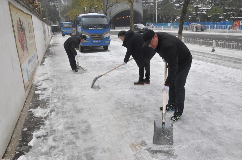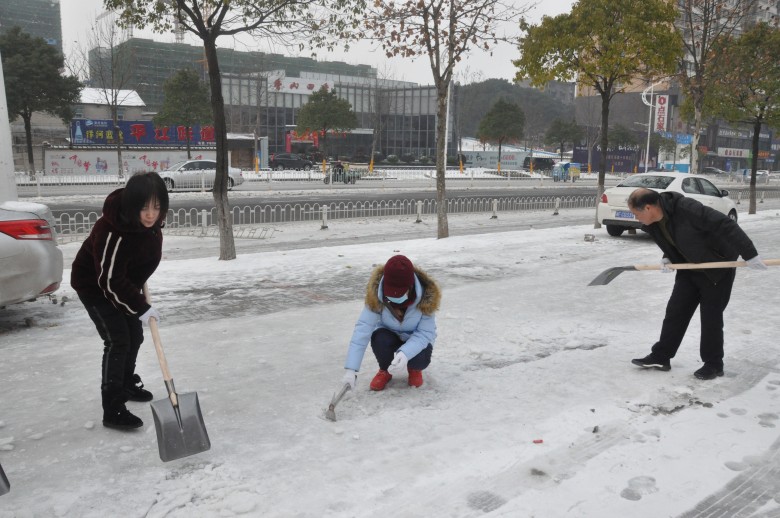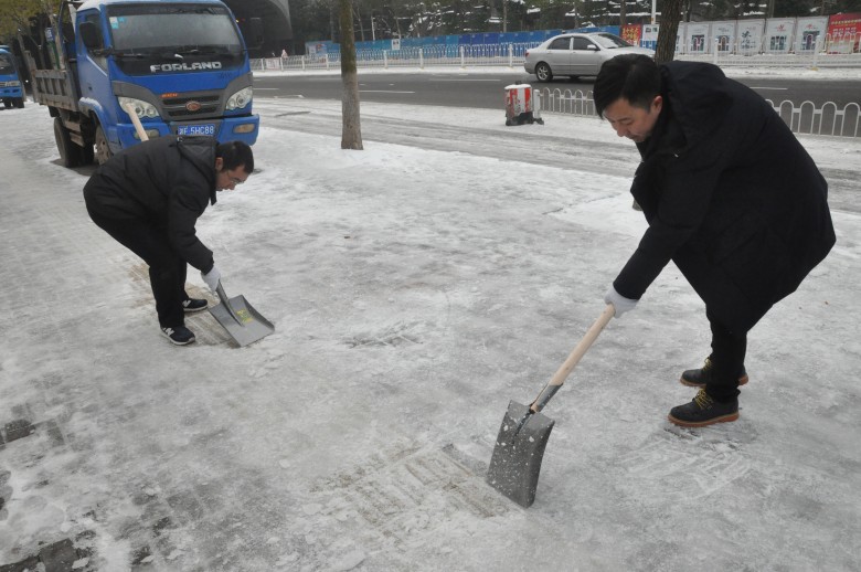 此时的路面上结成了厚厚的一层冰,在没有撒盐进行融冰的情况下,为提高扫雪除冰的效率,尽快方便过往路人通行,刘月平、宋洁、付晓斌各自带队分段进行铲雪疏导。