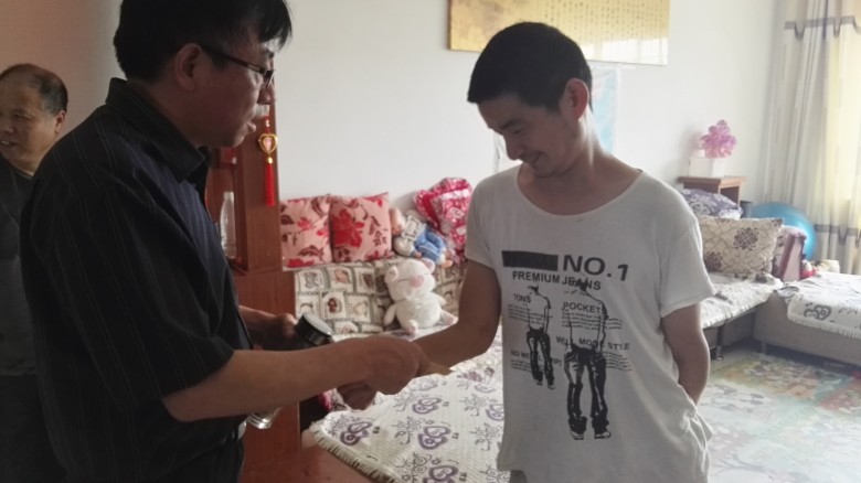 (图为中心党组书记、主任何四军和党组成员、副主任刘月平对贫困残疾人家庭进行走访)