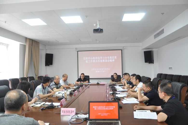 2018年7月5日下午,岳阳市公共资源交易中心在六楼会议室召开党组中心组扩大会议专门研究党建工作。会上党组成员、副主任刘月平传达了全市基层党建工作重点任务推进会精神,并就落实《中共岳阳市委组织部印发<关于推进党支部“五化”建设的实施意见>的通知》(岳组发[2018]21号)文件提出了要求。