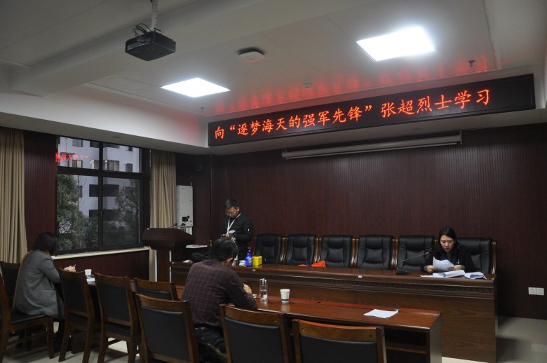 2018年11月16日下午,岳阳市公共资源交易中心在二楼一标室召开全体干部职工大会,组织大家向“逐梦海天的强军先锋”张超烈士学习。会上中心机关党委传达学习了《中共岳阳市委组织部关于开展向张超同志学习活动的通知》(岳组发[2018]31号)文件精神。