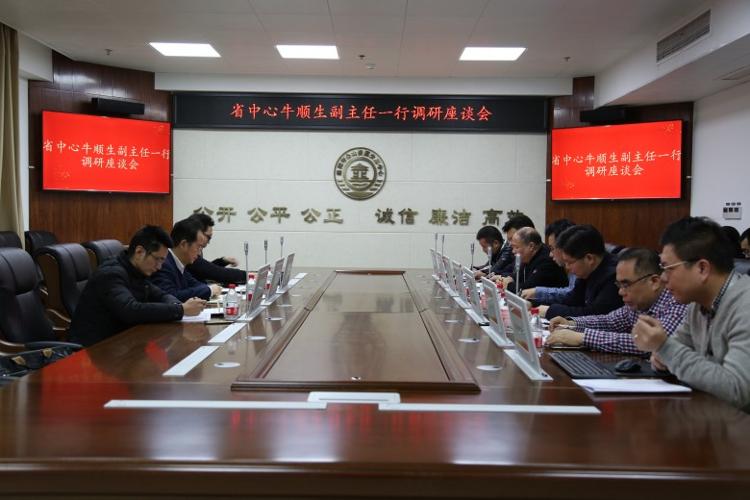 牛顺生副主任一行认真查看了中心的评标专家通道、专家抽取室、开标室、评标室、监控室等服务场所,认真听取了中心楼宇智能化建设相关情况,与中心相关科室人员进行了深入沟通,并在中心六楼会议室召开了专题调研座谈会。