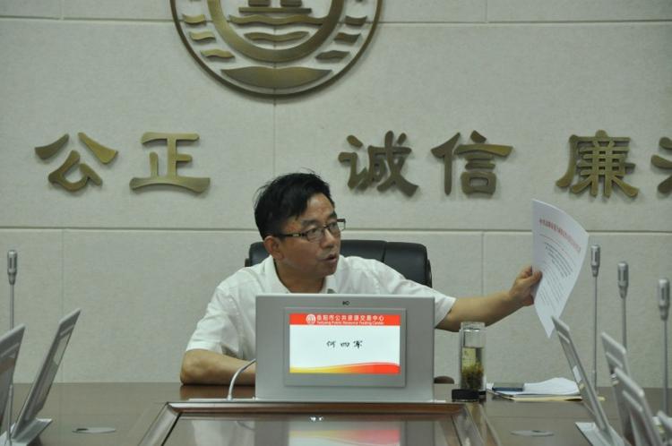 (图为中心党组书记、主任何四军介绍“全市优化营商环境工作推进会”会议内容)