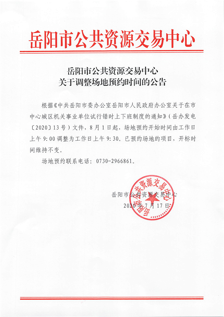 岳阳市公共资源交易中心关于调整场地预约时间的公告