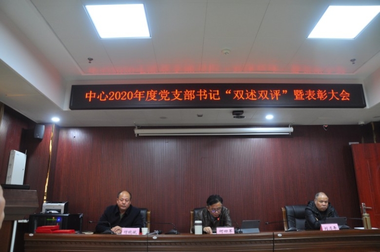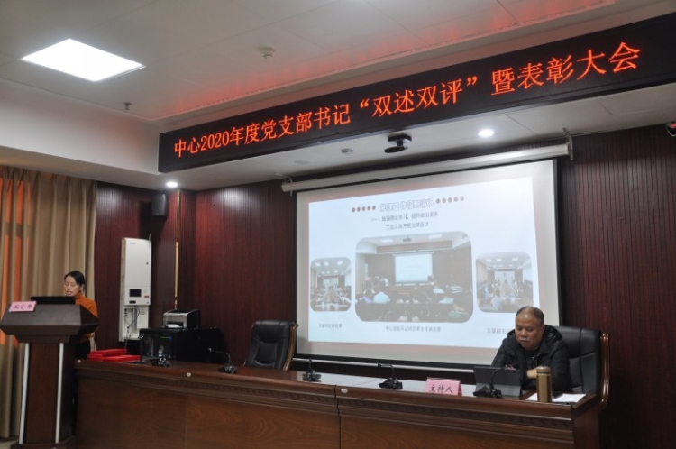 2021年1月15日,中心召开了2020年度党支部书记“双述双评”暨表彰大会。会议由党组成员、副主任刘月平主持,全体党员干部参加。会议主要有三项议程:第一项议程:由中心三位支部书记述职,党组成员、副主任、机关党委书记付晓斌点评,全体党员进行民主测评;第二项议程:中心党组书记、主任何四军讲话;第三项议程:中心党组成员、副主任付晓斌宣读《关于表彰先进基层党组织、优秀党支部书记、优秀党务工作者的决定》,由党组成员为获奖人员颁奖。