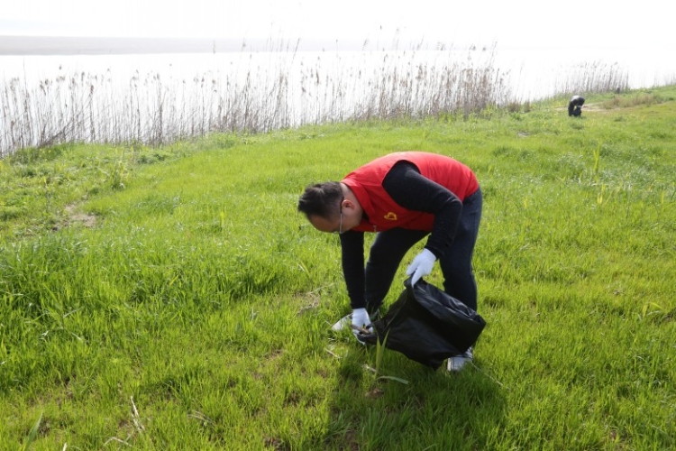 志愿者每人拿着一个垃圾袋在长江边上捡拾垃圾,而后又来到东洞庭湖湿地保护区向周围的农户和来往的行人发放“十年禁渔”倡议书。