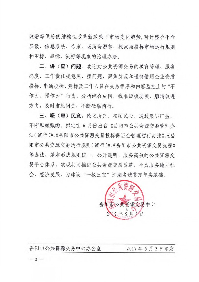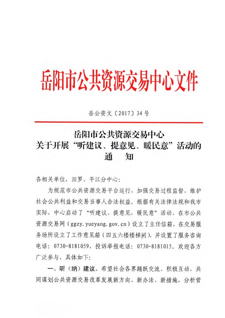 岳阳市公共资源交易中心关于开展“听建议、提意见、暖民意”活动的通知