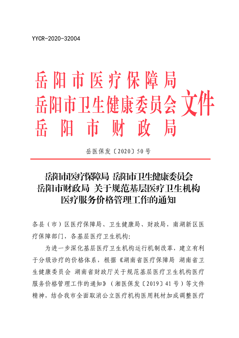 岳医保发50号:关于规范基层医疗卫生机构医疗服务价格管理工作的通知