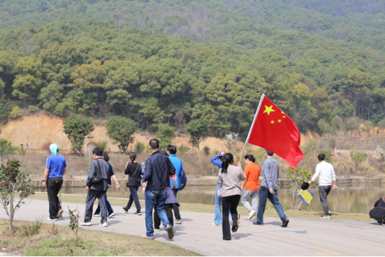 在麻布大山水库旁,水清岸绿,河畅景美,鲜红的党旗迎风飘扬,大家身着统一的志愿者服装,沿着水库徒步中,现场学习了习近平总书记在长江考察沿途的重要指示精神。
