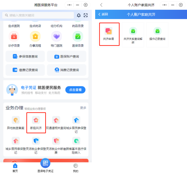 (一)第一步:下载“湘医保”APP,或进入“湘医保”APP小程序,登录后在首页“业务办理”中找到“家庭共济”,点击“共济申请”。