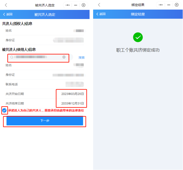 (三)第三步:输入被绑定人身份证号,选择共济时间,勾选承诺,点击下一步,绑定成功。