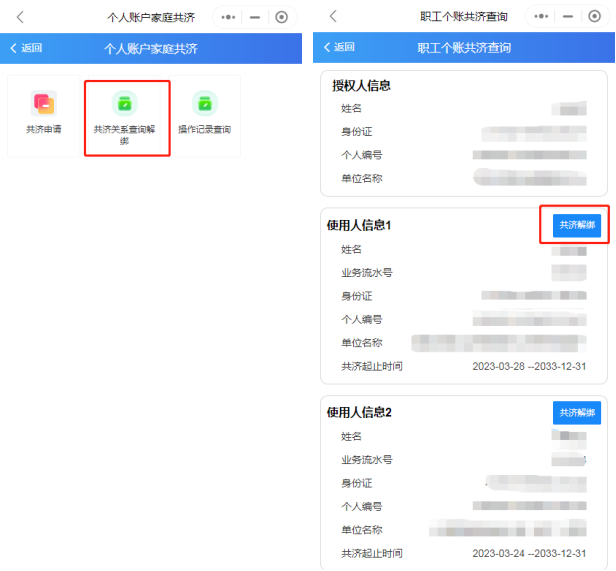 (四)第四步:办理完成后,可通过“家庭共济”---“共济关系查询解绑”查询绑定情况,“解除绑定”功能也可在此界面操作。
