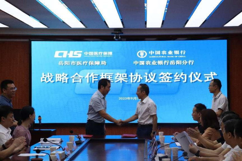9月7日,岳阳市医保局与农业银行岳阳分行签署“深化医保电子凭证全流程应用”项目战略合作框架协议。