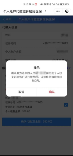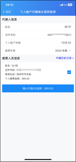 第二步: 找到个账代缴城乡居民菜单,点击进入后会显示已绑定的代缴人员信息,勾选缴费人员信息,点击“确认代缴”即可。