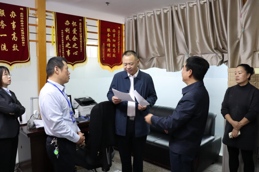 11月10日,市医疗保障局党组书记黄岳四到市医疗保障事务中心调研,实地走访市政务服务中心医保窗口,详细了解医保经办业务办理、医保窗口队伍建设等情况,召开调研座谈会,听取工作汇报和意见建议。市医疗保障事务中心班子成员、部室负责同志参加。