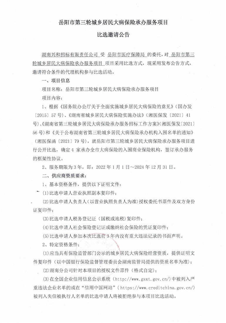 岳阳市第三轮城乡居民大病保险承办服务项目比选邀请公告