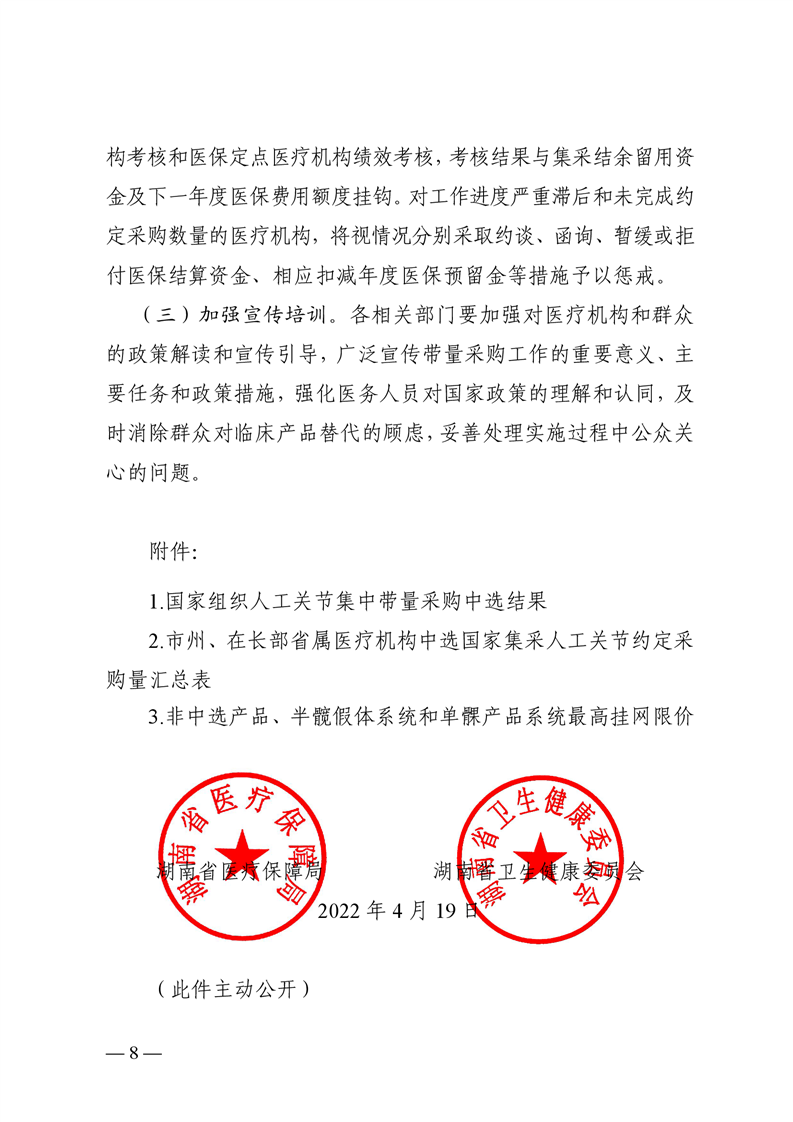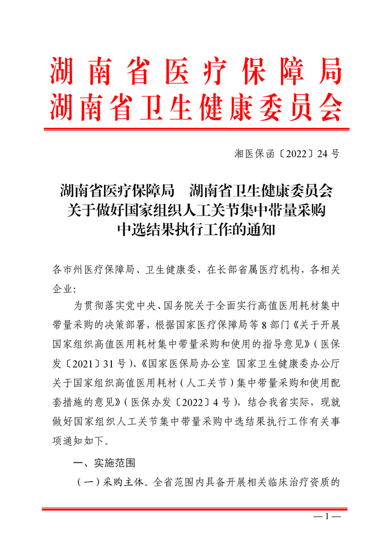 岳医保函〔2022〕14号--转发《关于做好国家组织人工关节集中带量采购中选结果执行工作的通知》