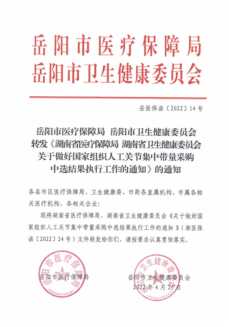 岳阳市医疗保障局 岳阳市卫生健康委员会转发《关于做好国家组织人工关节集中带量采购中选结果执行工作的通知》的通知
