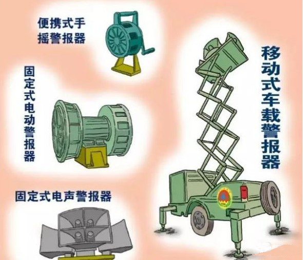人民防空警报器可分为电动警报器、电声警报器和多媒体警报器。按照使用方式,可分为固定警报器和移动警报器,移动警报器又可分为车载警报器和手摇警报器。