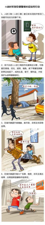 通常在发现敌机有空袭征候时,发放预先警报。听到预先警报后,应立即拉断电闸,关闭燃气,熄灭炉火,盖严储存饮水,转移易燃物品,关闭门窗,帮助老幼病残,携带好个人防护器材和必须的生活用品(食物、水、证件),迅速有序地就近进入人防工程或指定的安全隐蔽地域。